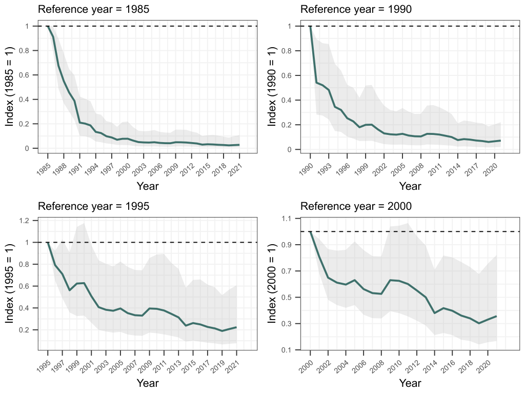 Using this information as a basis, we then set about using metapopulation simulations to understand how this drop in survival rates constrains where these frogs can and cannot now live. We ran simulations of metapopulation trajectories varying fecundity rates (representing variation in habitat quality), annual variation in fecundity and survival rates (representing environmental stochasticity) and the number and proximity of habitat patches within a landscape (representing both habitat availability and connectivity). These simulations revealed that among the many combinations of these parameters, contemporary metapopulations of these frogs — with their depressed survival rates due to chytrid — could persist in much smaller zone of the parameter space than was historically the case. To survive, contemporary metapopulations needed high habitat quality (i.e., very high fecundity), low environmental stochasticity (low variation in fecundity and survival) and high habitat availability and connectivity. In short, our simulations revealed that chytrid has shrunk metapopulation viability for SBFs and GGBFs, to landscapes in which demographic resilience is at its highest — those with lots of top-quality habitat that provides fairly predictable conditions from one year to the next.