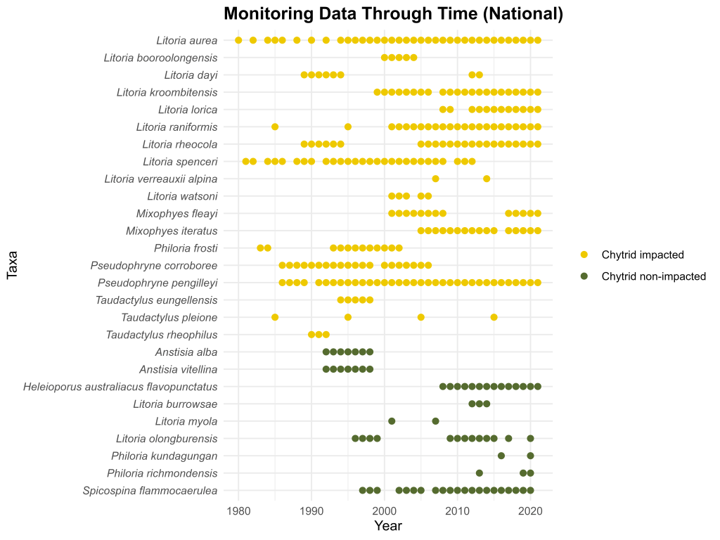 Of course, this all makes perfect sense and aligns with other studies on chytrid impacted frogs in Australia and elsewhere. But what this study contributes is a deeper understanding of the demographic mechanisms of persistence, and ultimately the environmental variables that underpin these mechanisms. In doing so, it gives us insights into the patterns of range contractions that Australian frogs have shown following the arrival of chytrid fungus to our shores, and it can be used to guide management to secure remnant populations. As we explain in the paper, if we can implement management that increases habitat availability and connectivity, increases recruitment rates and moderates the impact of environmental variation (like rainfall and temperature variability delivered by cycles of El Niño and La Niña), then we stand a good chance of enabling these populations to withstand chytrid-related mortality. Think of it this way — we can make these frogs resistant to the fungus, but through demographic levers, not immunological or evolutionary ones.