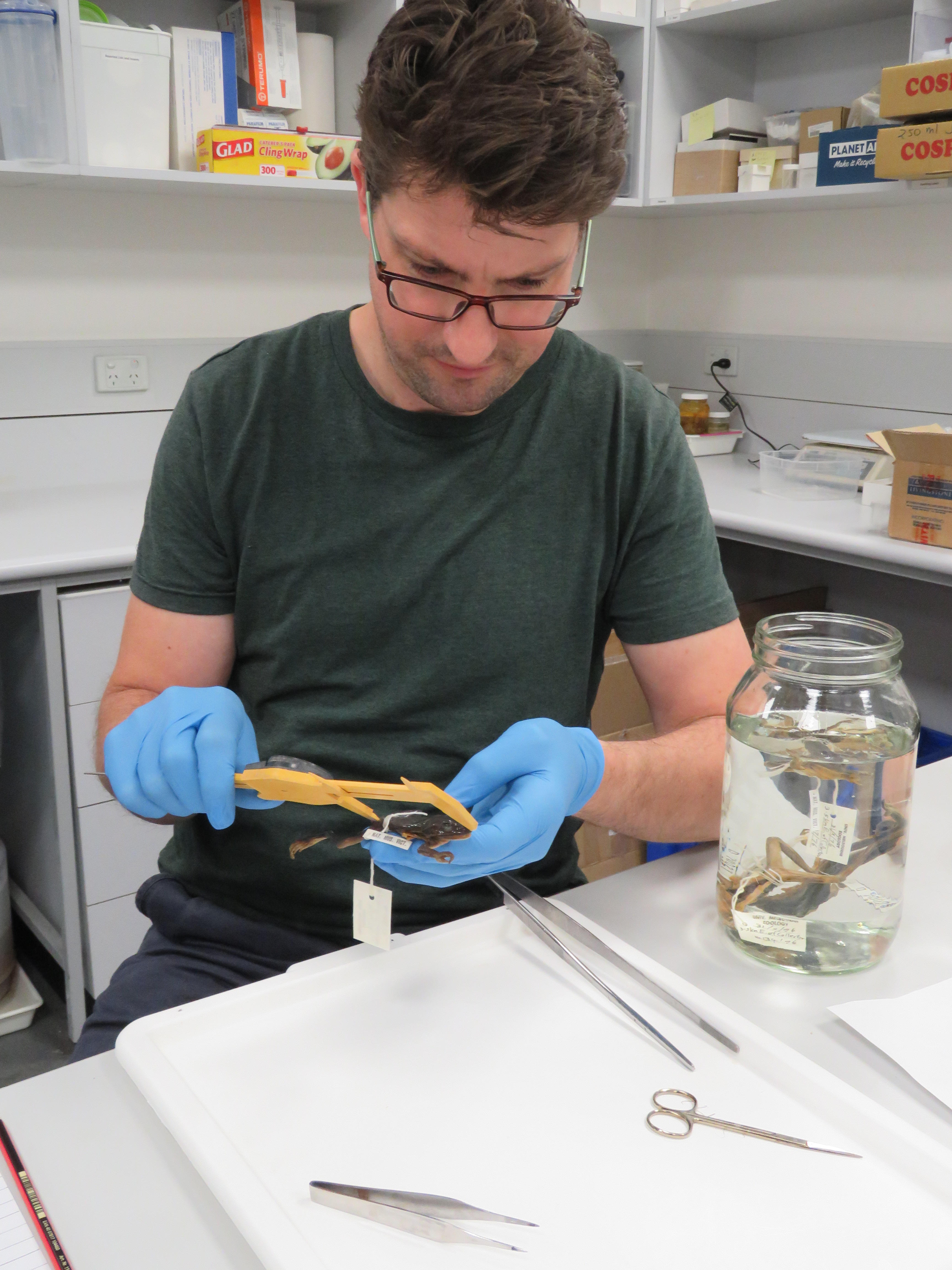 And so, we took ourselves off to the Museum. With the help of curators at the Melbourne Museum, the Australian Museum and the CSIRO National Wildlife Collection, we tracked down pickled SBFs and GGBFs that had been collected before chytrid arrived in Australia. We sought out specimens that were collected at sites close to those at which we’d worked on persisting populations of these frogs — Melbourne’s northern plains (a stone’s throw from Murray and Bill’s swamp at Upper Plenty) and the Southern Tablelands of NSW. We took bone samples from each specimen by removing one of their toes, just as we’d done during our contemporary sampling. And with that, we had matched bone samples from these areas pre- and post-chytrid, which we could use to age each frog and compare longevity and survival rates before and after the fungus arrived. We did this by counting lines of arrested growth (LAG) in bone cross sections, which are laid down during the winter torpor period (consider LAG the frog eqivalent of tree rings). The process is known as skeletochronology.